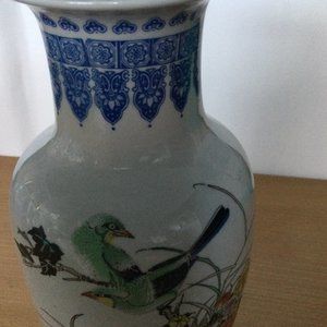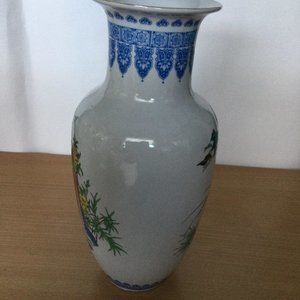 Vintage Chinese? porcelain vase decorated with flowers and birds 10 1/4" tall