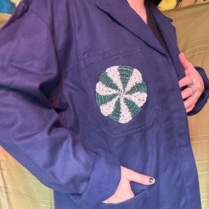 Vintage Navy blue chore / utility jacket with crochet green and white peppermint patch