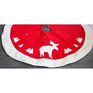For your consideration a vintage Christmas Tree skirt with an appliqued moose and trees.