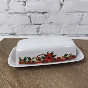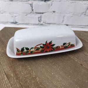 Vintage Christmas dishes, Ancam Poinsettia pattern butter dish with lid