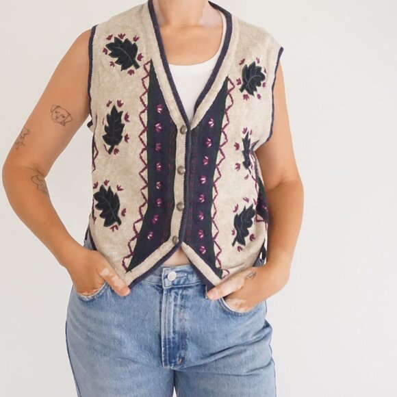 This Vintage Christopher & Banks sweater vest is a perfect blend of Cottagecore and Eclectic Grandpa style, featuring beautifully hand-embroidered leaf motifs throughout. Deep forest green appliqué leaves sit against a warm oatmeal knit base, accented with plum-colored buds, zig-zag stitching, and textured vine details that wrap around the vest in a subtle patchwork-inspired layout. The rich fall palette gives it that earthy, nostalgic feel that pairs effortlessly with denim, turtlenecks, or crisp white blouses.
