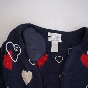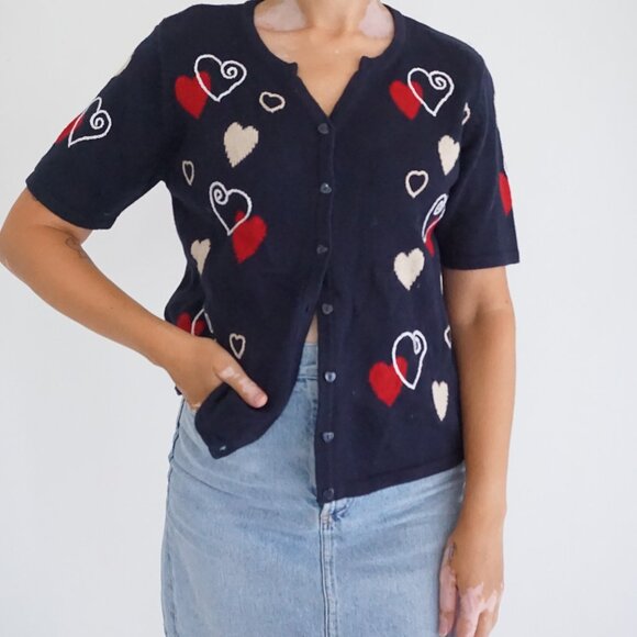 Vintage Christopher & Banks Navy Heart Button Front Knit Short Sleeve Cardigan S