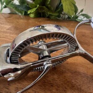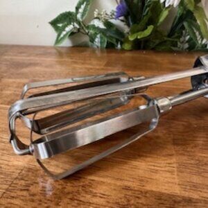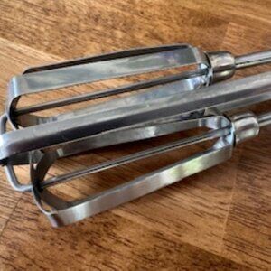 A timeless piece of culinary history, this vintage chrome hand crank egg beater brings classic charm and reliable functionality to your kitchen. With its gleaming stainless steel beaters and crisp white plastic handle and knob, it’s a lovely collectible or practical tool for any retro home cook.