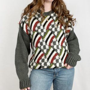 Vintage Chunky Knit Woven Plaid Argyle Striped Oversized Sweater Slouchy Cozy XL