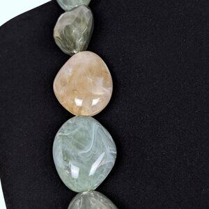 This vintage necklace is beaded and has an adjustable silver tone lobster claw closure (which might be a replacement). The beads are big and chunky and come in 3 colours: yellow, green, and blue, each of which are mixed/swirled with white. The beads are warm to the touch, are some what translucent, a low tapping noise, and sub surface cracks (which are the "crackle", and part of the design, not from wear). The beads are smooth and graduate gently from front to back. The necklace has a decent weight and is medium length. There is normal wear, but no issues affecting wearability.