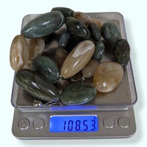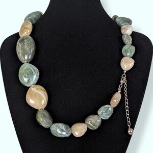 This vintage necklace is beaded and has an adjustable silver tone lobster claw closure (which might be a replacement). The beads are big and chunky and come in 3 colours: yellow, green, and blue, each of which are mixed/swirled with white. The beads are warm to the touch, are some what translucent, a low tapping noise, and sub surface cracks (which are the "crackle", and part of the design, not from wear). The beads are smooth and graduate gently from front to back. The necklace has a decent weight and is medium length. There is normal wear, but no issues affecting wearability.