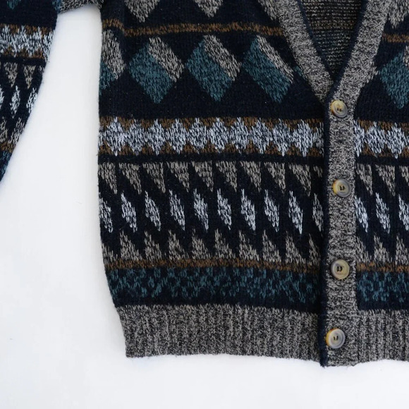 This cardigan likely has a slightly quirky and eclectic vibe, perfect for layering over a simple shirt or turtleneck to let the pattern and texture be the focal point of the outfit. The loose, relaxed fit common in grandpa cardigans also makes it ideal for casual, laid-back styling while still keeping the look interesting.