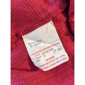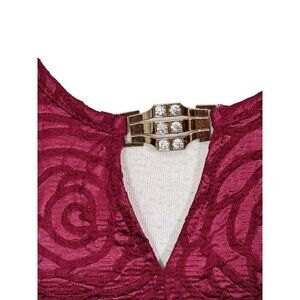 This Vintage Claire France Women's Plus 3X Textured Tunic Top is a stylish and unique addition to any wardrobe. The floral pattern, V-neckline with attached brooch, and 3/4 sleeves make it perfect for various occasions such as parties or business events. Made from a stretchy polyester-spandex blend, this tunic offers a comfortable fit for any season. The red color with black accents and rhinestone detailing adds a touch of glam and femininity to this artsy and romantic top from the Claire France brand. Made in Canada.