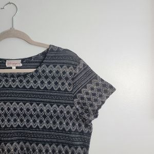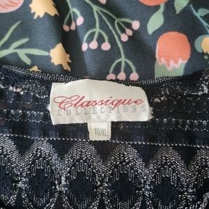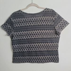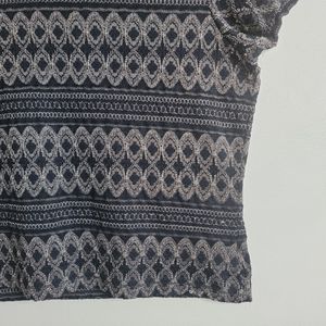 This stunning top is full of texture. It is more of a deep navy blue but almost to the point of being black. It is super stretchy and comfortable. There are some signs of wear as shown in the photos. There are no visible rips or stains. Measurements are taken by me with the shirt lying flat. Dimensions may vary slightly.