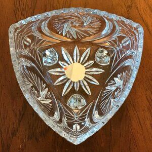 Vintage triangle shaped glass three footed bowl with sawtooth edge