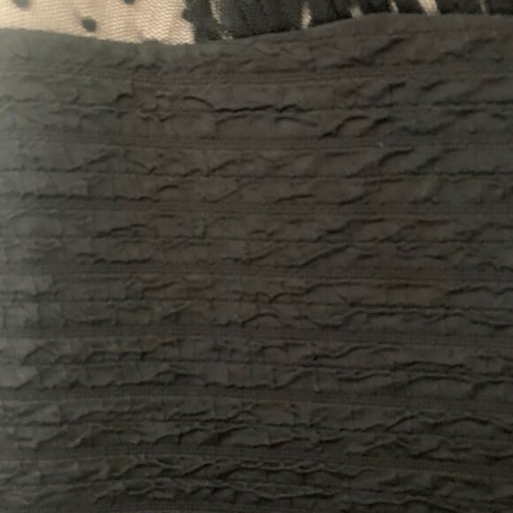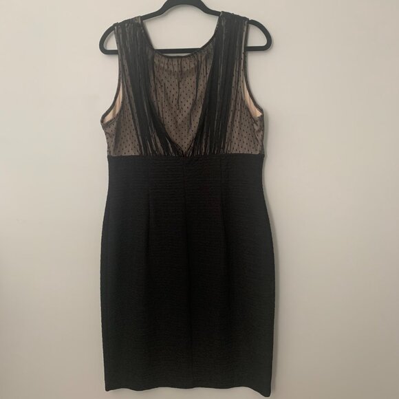 Cleo black and tan from fitting black and tan dress, deep v-neck. Sheer black polka dots on the top with tan lining. Elegant vintage party cocktail dress.