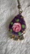 This is a beautiful pair of vintage dangle earrings featuring a unique, teardrop-shaped design. The front of each earring is decorated with a detailed cloisonné enamel finish, showcasing a delicate pink rose surrounded by green leaves on a deep purple background. The bottom of the teardrop is adorned with three shimmering clear rhinestones, adding a touch of sparkle.