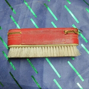 Red, 1940's, leather clothing repair kit and clothes brush. Labeled "British Moroccan Worthington" Including nail file, needles, thread on wooden spools, a bobbin and paper tape measure. This is from my Grandmother's house with my Mother's name in it in her childhood handwriting.
