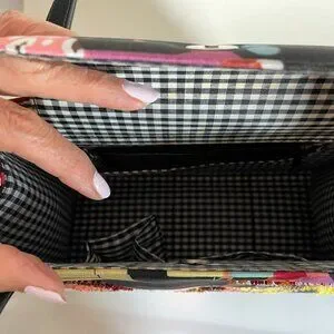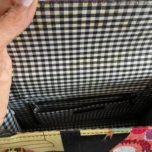 Inside of bag has large roomy inside section, 1 zipper compartment and 1 pouch divided compartment on inside of purse.