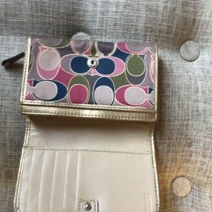 Gorgeous Vintage Coach Wallet in dark tan, navy, evergreen, mauve.