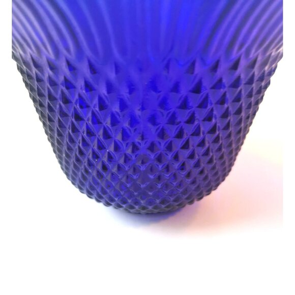This striking vintage bowl is crafted from rich cobalt blue glass, featuring a beautiful diamond-point texture and an elegant ruffled edge. Likely American-made during the mid-20th century by makers such as Fenton or Indiana Glass, this piece showcases the artistry and charm of pressed glass design.