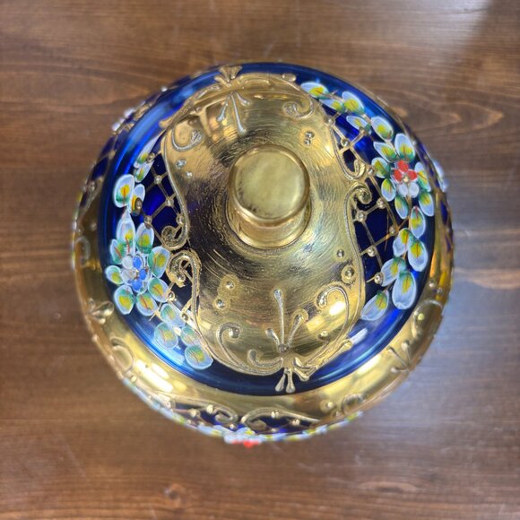 This vintage cobalt blue glass vanity jar features ornate gold overlay with raised enamel floral decoration, a domed lid with a knob, and vibrant hand-painted detailing. Likely Venetian or Bohemian glass, it is unmarked but displays the fine craftsmanship associated with mid-20th century decorative art. Made of rich cobalt glass with applied gold and enamel, this striking piece is ideal for display or use as a trinket or jewelry jar, adding an elegant touch to any vanity or collection.