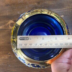 Vintage Cobalt Blue Glass Vanity Jar with Lid Gold Enamel Floral Bohemian Jar