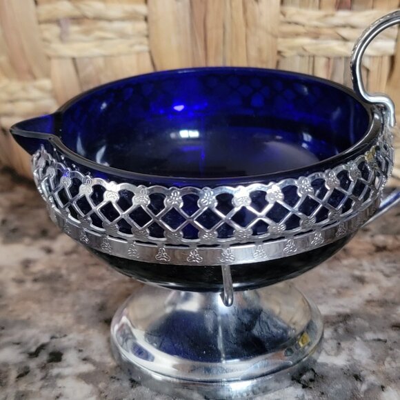 Vintage Cobalt Blue Pedestal Pierced Chrome Jam/Sugar/Creamer Set-1950s