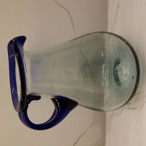 Vintage Cobalt Blue Rim and Handle with Light Blue Bubble Glass Jug Pit…