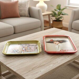Add a touch of classic Americana and nostalgia to your home, kitchen, or collection with this charming set of two vintage Coca-Cola trays. Featuring the iconic red and white branding, these small metal trays are perfect for serving drinks, holding keys or change, or simply displaying as retro wall art.