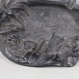 Up for sale is a vintage Coco Joe lava ashtray. This ashtray is the classic Coco Joe ashtray. The asthray features a molded Coco Joe under a palm tree with a bood on his lap. Coco Joe is stretched across the base of the ashtray. There are two molded cigarette holders at the end of the ashtray. What a great addition to any tiki collection.