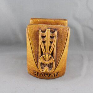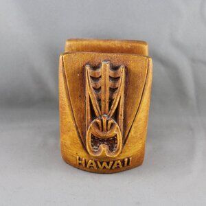 Up for sale is great island piece. This is a vintage Coco Joe's Lono Napkin Holder. The piece features the face of the tiki god Lono on both side with the word Hawaii underneath. It has very unique tan look that only comes from Happa wood. This piece still have the original Coco Joe description piece on the base. What a perfect piece for your summer parties. It makes a sickly cool mail holder as well.