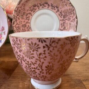 This beautiful vintage pair of Colclough bone china teacup and saucer sets is made in England and features two different pink floral designs. One is a romantic rose bouquet with gold trim on soft blush pink, and the other has intricate gold damask-style overlays on a pale pink base. Elegant and timeless, these are perfect for tea lovers, collectors, or feminine vintage décor displays.
