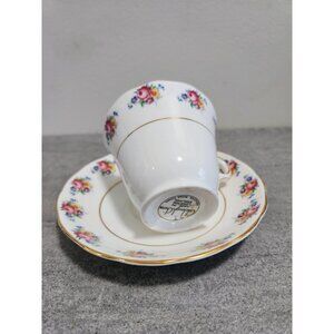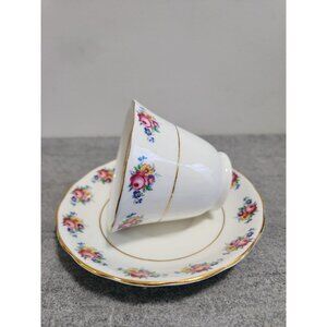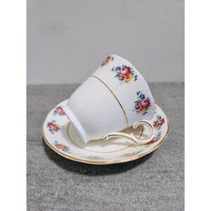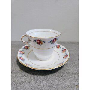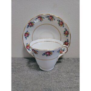 Slight scallop edge to the saucer of this Colclough tea cup and matching saucer. A band of roses decorate the top of the tea cup and the top edge of the saucer. Excellent for display or gifting!