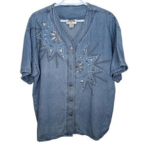 Vintage Colon Made in USA Denim Button Down V Neck Bedazzled Jewel Top M