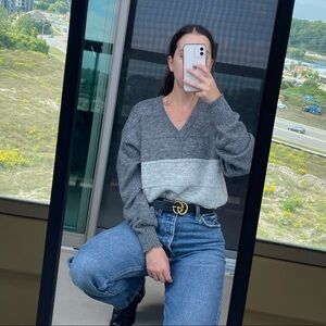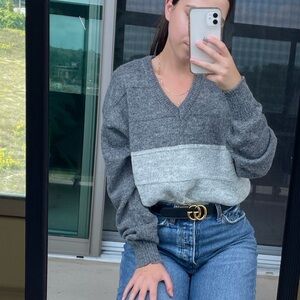 Vintage Colour Blocked Grey and White V-Neck Sweater Size Medium