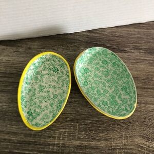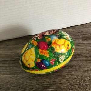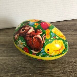 Featuring vibrant green grass, yellow chicks, a brown rabbit and blue, red, and pink hues. Open the box and the inside is a beautiful white and green floral pattern.