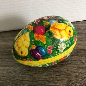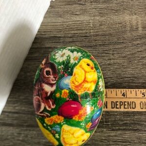 Featuring vibrant green grass, yellow chicks, a brown rabbit and blue, red, and pink hues. Open the box and the inside is a beautiful white and green floral pattern.