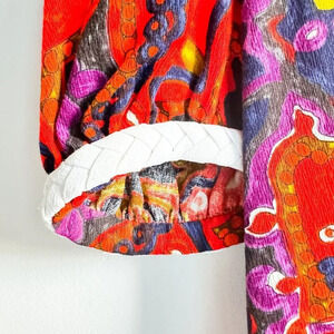 Embrace the bohemian spirit with this vintage maxi dress from THC Hawaiian Textiles. The colourful paisley print and barkcloth detailing make it a truly unique piece that is sure to turn heads.