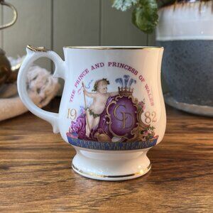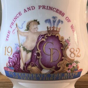 Description 🤴The front of the cup has the wording ‘The Prince and Princess of Wales, to celebrate the birth of their first child 1982’ on a blue banner beneath the main motif. The initials for Charles and Diana are entwined in the centre and there is a cherub and pink flowers also adorns the piece. This design is also repeated on the rear of the mug. Very nice addition to your collection of British Royal Memorabilia in this year of the Coronation of King Charles III.