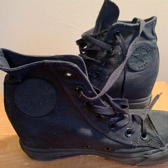 Black canvas Converse hi tops with hidden wedge heel. Super comfortable and make your feet look smaller! Size 8 but will work for 8.5 as well.