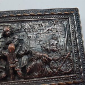 A vintage copper brooch featuring a farm scene with a family at work. A man in the background is storing wheat or hay while in the foreground a boy tries to help (or annoy) his mother who is holding a basket. Around them are chickens, a cow, farming implements and sheaves of hay or wheat. The brooch comes in a blue Birks jewelry box, Birks being Montreal's high end boutique; it is not original to the brooch though its a wonderful fit. The brooch is attached with a pin and is about 1 7/8" tall by 3 1/8" wide. The box is 2 1/2" deep by 3 1/4" wide and about 1 1/4" tall.