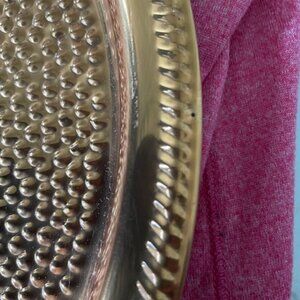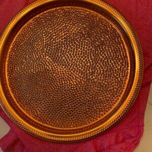 Vintage Coppercraft Guild Hammered Copper Round Tray 12.25" in Diameter - Solid Copper Dimpled – brand new – still has original stamp on back -Coppercraft Guild Taunton Mass. Ground Hammered Copper 12 3/8"- edges .50 “ height - Vintage Serving Tray / Platter.....You will enjoy this beautiful Hammered copper Serving Tray. Use it outside in the sun for a gleaming drink service or use in candlelight for a great reflective event. Great collector’s item. Excellent condition - smoke/pet free home .