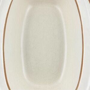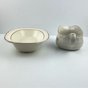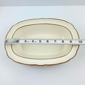 Cordella Collection Vintage Stoneware. 1970s - 80s Serving Set: Vegetable Dish and Gravy Boat. Burnet pattern - brown, peach and yellow flowers. Dish is 10 X 7 X2 inches. Gravy boat holds 16 ounces.