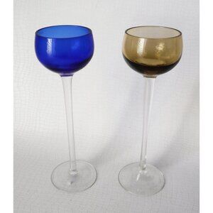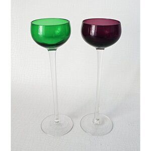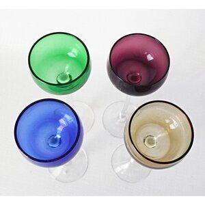 For your consideration are four vintage beautiful set of four cordials with a pretty clear tall stems in colors of blue, green, tan and purple.