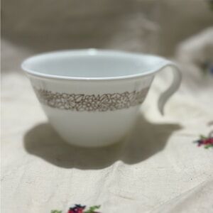 Elegant white mug with a brown floral pattern. Perfect for any dining setting.