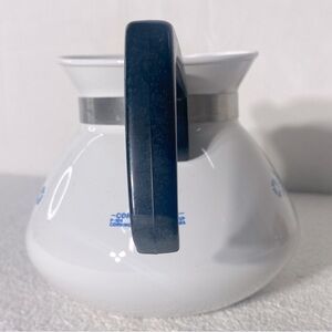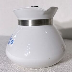 This Corningware teapot I s a timeless addition to any kitchen, featuring a white body adorned with a classic blue cornflower pattern. Its simple yet elegant design is complemented by a black handle and a silver lid, making it both functional and stylish for your tea needs.