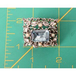 For your consideration is a vintage brooch with seed pearls and a blue center signed Coro.