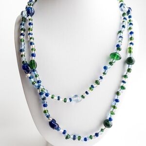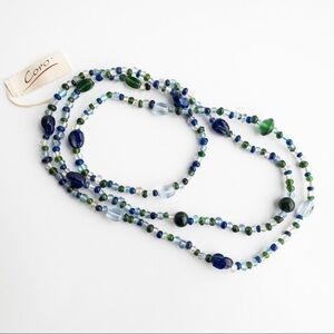 Vintage Coro glass beaded long flapper necklace. Necklace accented with blue, green and clear asymmetrical glass beads. Wear it long or multi-layer it on its own or with other necklaces. New old stock with Coro TM tags. Vintage from 1980's 1990's. Modern retro. Will require light cleaning.