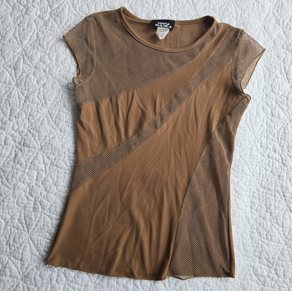 Vintage Costa Blanca Honey Brown Mustard Mesh Fishnet Panel Cap Sleeve Top