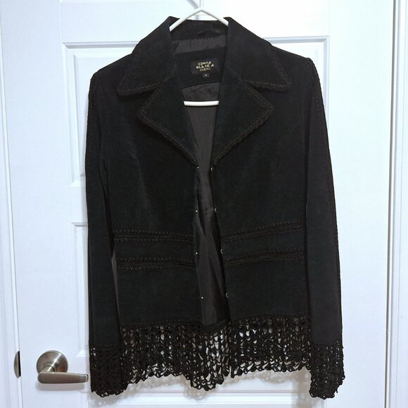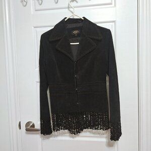 Vintage Costa Blanca tan suede leather blazer with fabric frills. I liked this style so much that I bought this black one and a tan one (also listed)