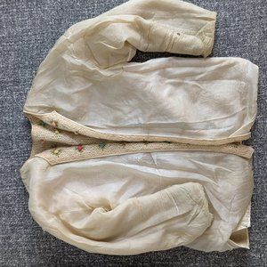 Vintage off-white knit cardigan with embroidered roses around the neck, center front and sleeve cuffs. Hook and eye closure at the center front, and hook and eyes at the hip slits. Fully lined.