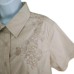 100% cutting blouse with beading and embroidery. Button down and collared. Slits on both sides at the hips.