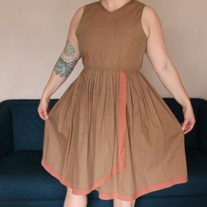 100% cotton vintage dress in muted brown with orange edging. Excellent vintage condition. It has a full skirt with a snap to keep it closed on windy days. Sleeveless with a high v-neck.