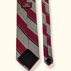 This vintage tie by Countess Mara is made of 100% silk and has a pattern of diagonal stripes in red, white, navy, and grey. The interior of the tie is black. There is a tag inside the bottom of the thin end that lists material content, and a maker's tag on the back of the thick end that can be used to secure the thin end. There is normal vintage wear but nothing that affects wearability.